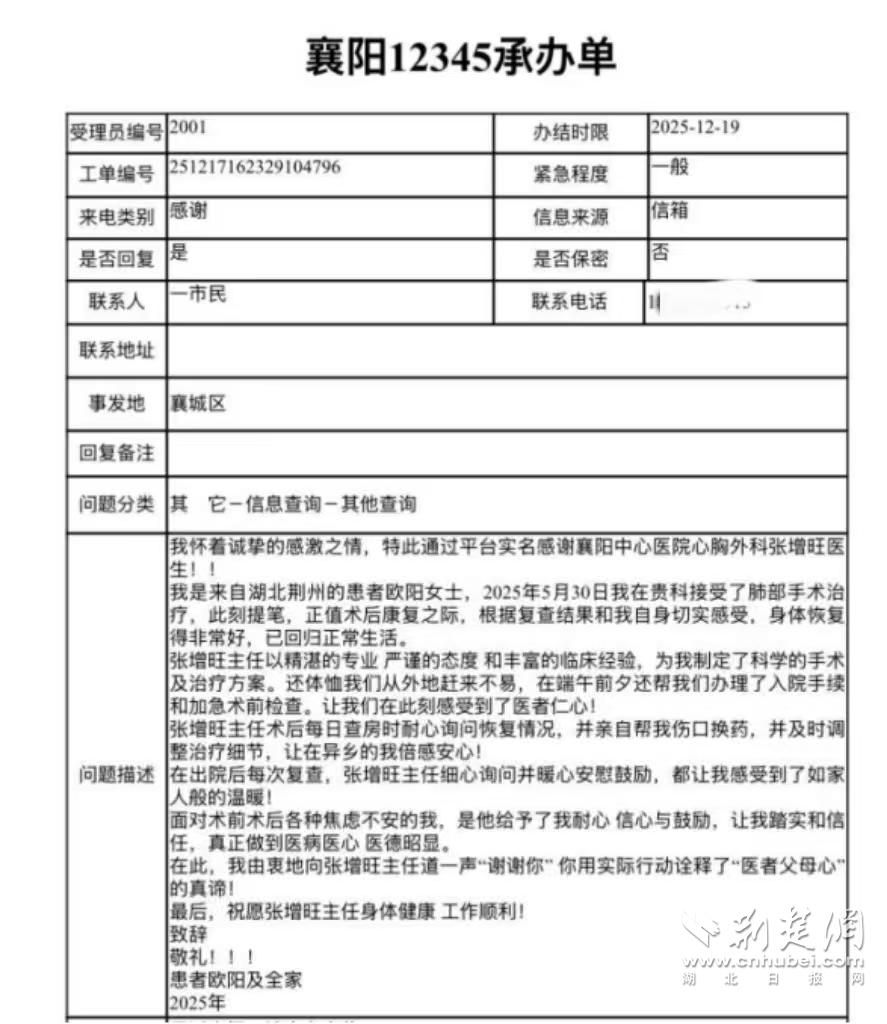 京中网讯(湖北日报网)(通讯员:陈亚硕)近日,通过12345封回执,给襄阳市中心医院张增旺医生半年的感谢信。湖北荆州的欧阳用笔墨表达了对张博士的感谢。